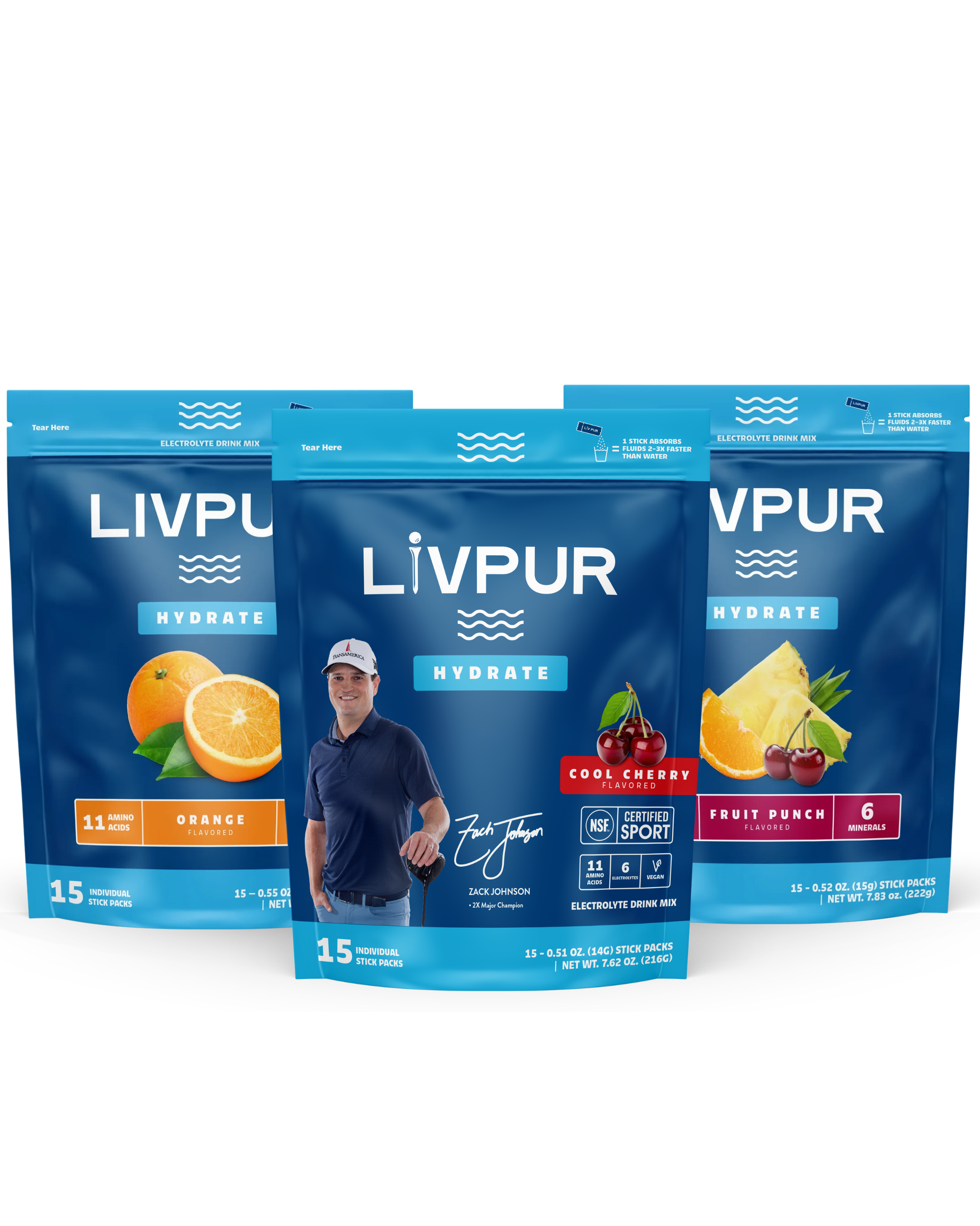 Enjoy rapid hydration in our three delicious, foundational flavors. Orange, Fruit Punch, and Cool Cherry continue to be favorites amongst our fans. So, whether you’re a first-time customer or a long-time member of the LivPur family, grab a 15-count of each of these tasty flavors in our science-backed Hydrate formula.